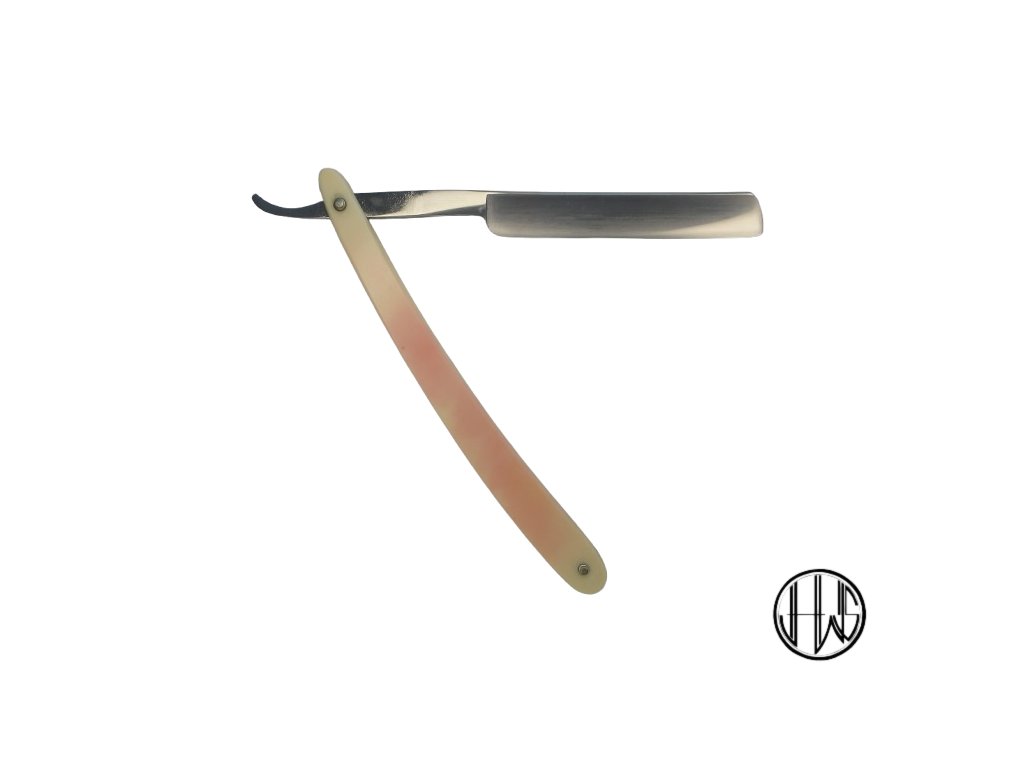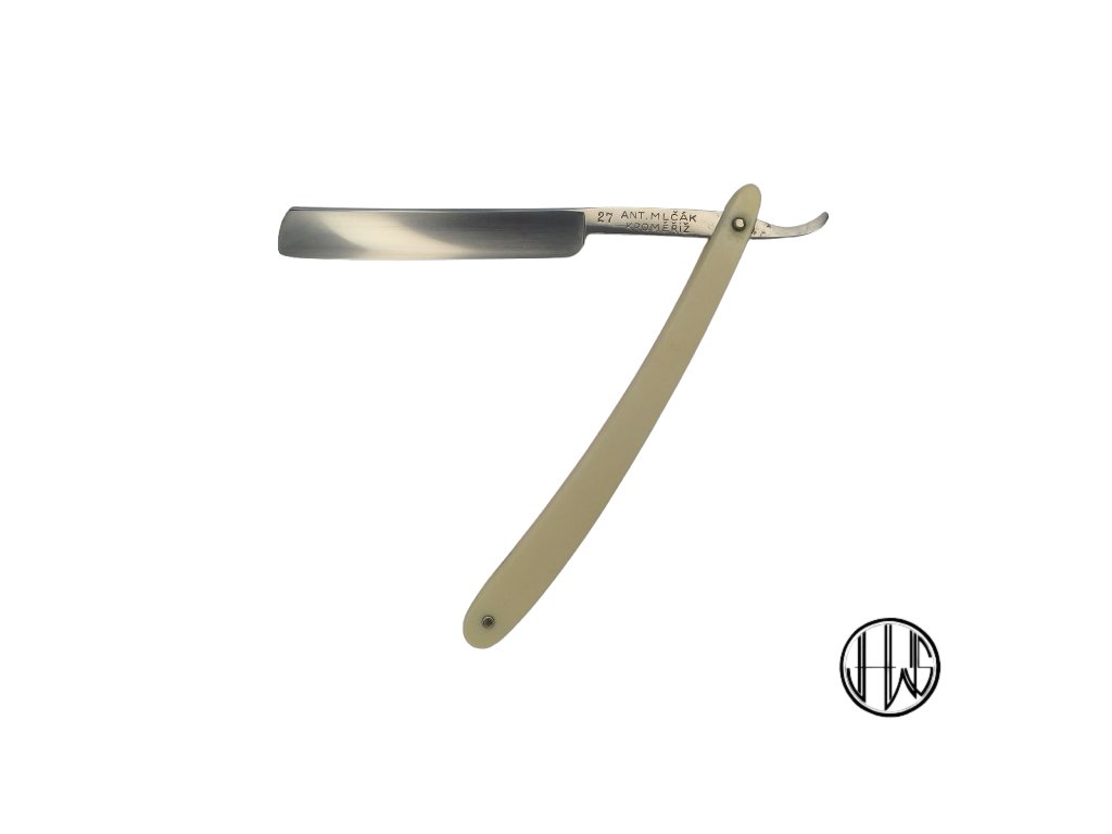 Prvorepubliková, nikdy použitá 3/8 čtvrtdutá břitva s francouzskou hlavou v bílých plastových střenkách z jedné strany obarvenými jinou břitvou. Nikdy proto nedávejte různobarevné břitvy do furtálu těsně vedle sebe. Tuto břitvu si ale poznáte mezi všemi docela bezpečně!