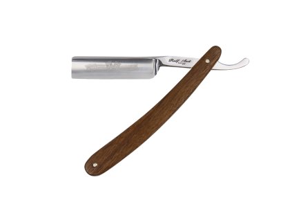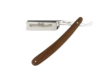 Kvalitní břitva značky Ralf Aust s kulatou hlavou ručně vyráběná v německém Solingenu, čepel 5/8 palce z nejlepší oceli a střenkami z odolného červeného dřeva (redwood).