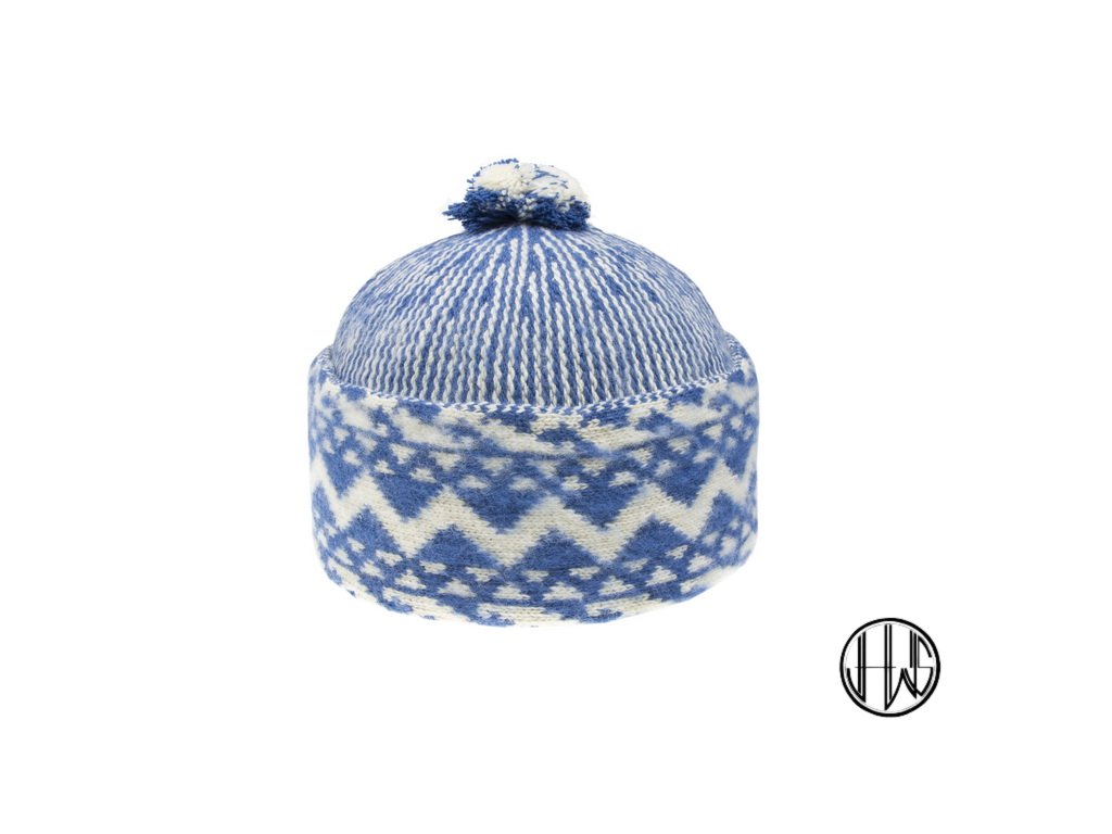 Tradiční čepice "zmijovka" se vzorovaným zahnutým lemem a bambulkou.